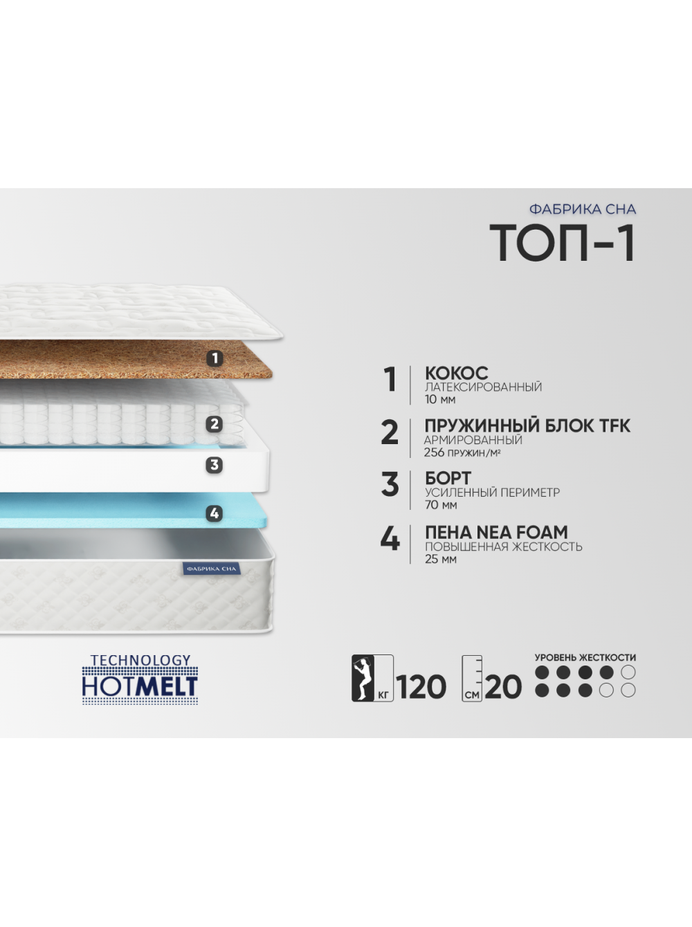 5. Евро периметр Система жесткого периметра матраса выполнена из пены высокой плотности. Располагается внутри матраса, создает идеальную форму его боковой части и дополнительно повышает жесткость краев, защищая их от проседания при нагрузках.